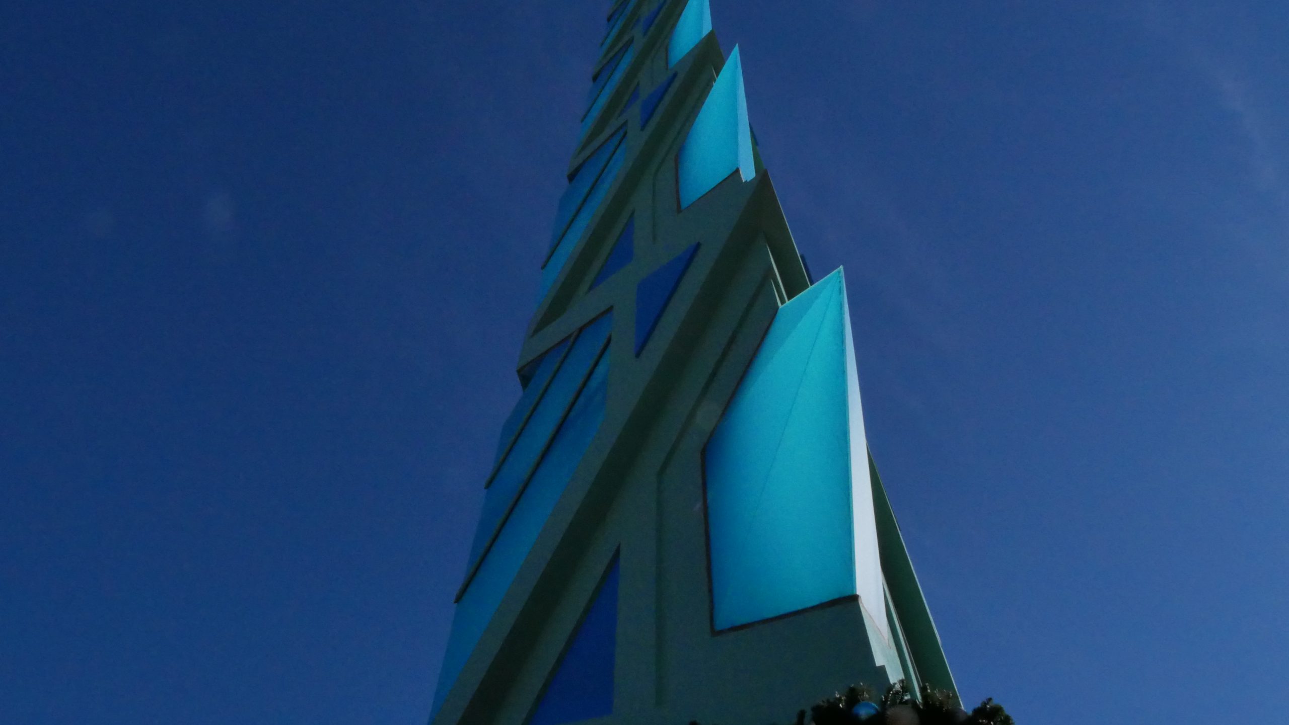 The structure is built of glass and 1,700 pieces of steel. The spire weighs upwards of 75,000 pounds. During the night the spire glows blue and green and can be seen from far off. The spire sits in a courtyard surrounded by desert plans, water features, and metal sculptures. There is a veranda in the courtyard for shade.