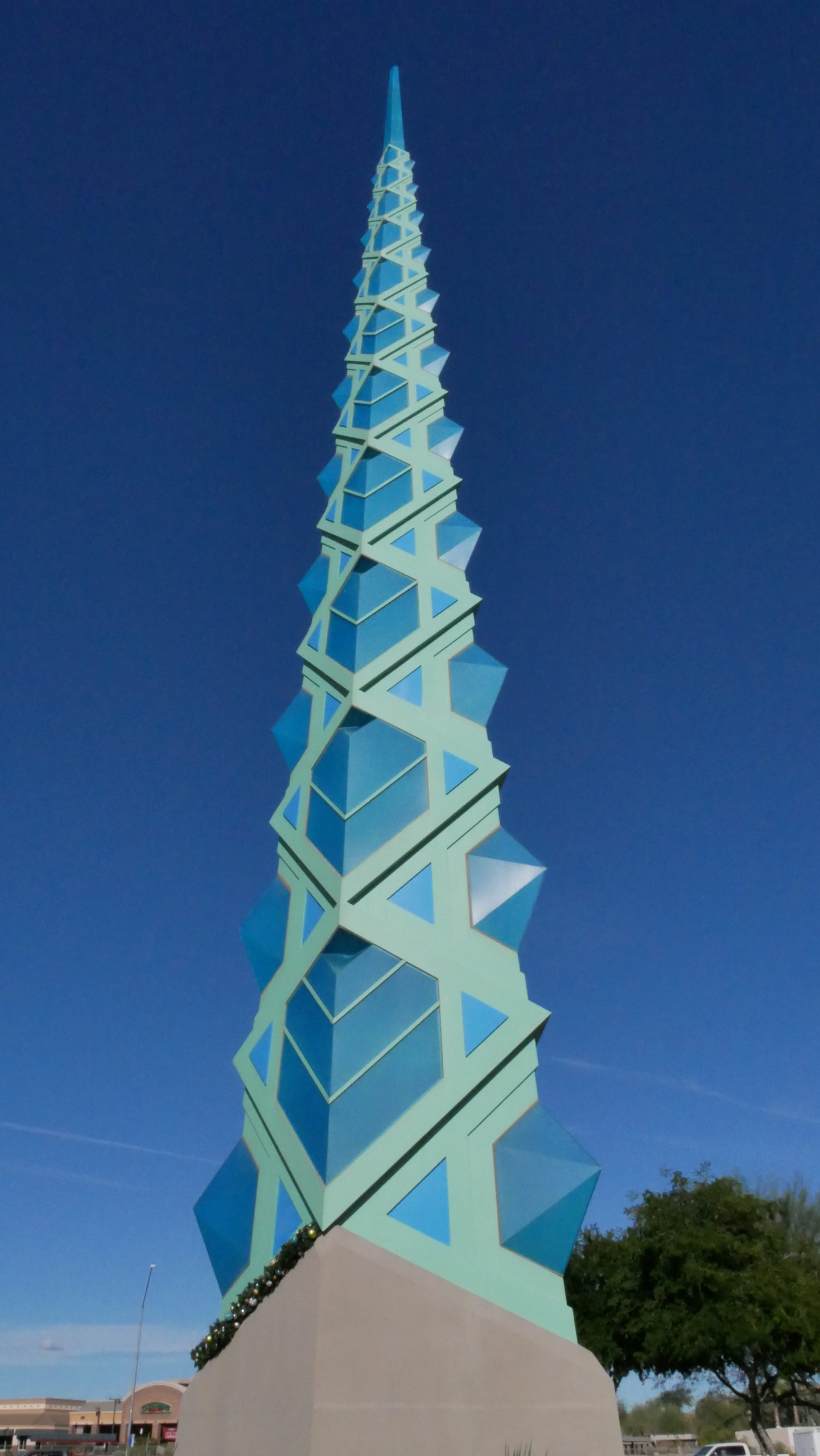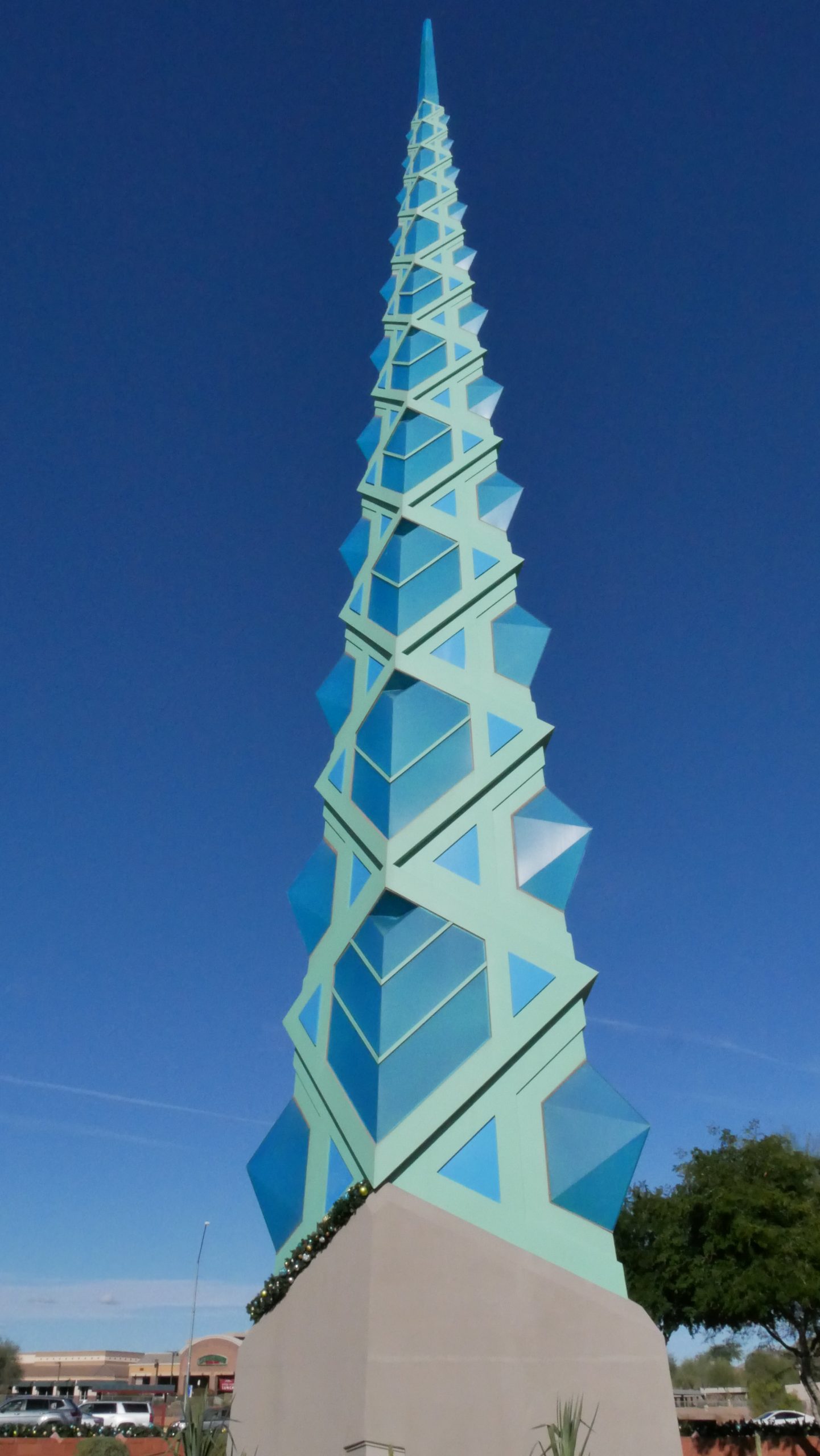 The structure is built of glass and 1,700 pieces of steel. The spire weighs upwards of 75,000 pounds. During the night the spire glows blue and green and can be seen from far off. The spire sits in a courtyard surrounded by desert plans, water features, and metal sculptures. There is a veranda in the courtyard for shade.